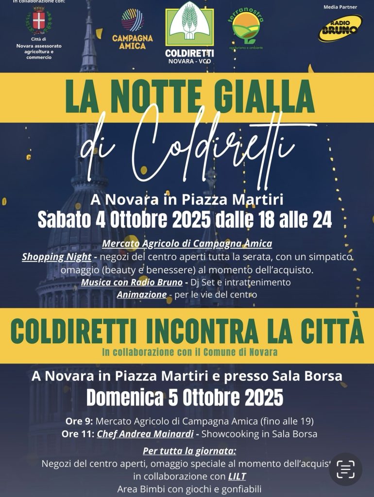 Novara è pronta a colorarsi di giallo. Sabato 4 e domenica 5 ottobre andrà in scena la “Notte Gialla” targata Coldiretti in collaborazione con il Comune di Novara e l’assessorato all’Agricoltura, al Commercio e all’Artigianato. Un evento unico per la città che unisce cibo a km0, cultura del territorio e alla valorizzazione del mondo agricolo, pensato per coinvolgere grandi e piccoli in un'esperienza autentica, educativa e divertente.